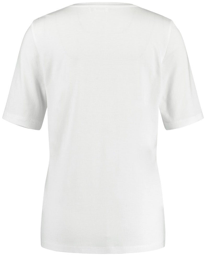 Breite Ausschnittblende. Platzierter Frontprint mit Wording. Dieses T-Shirt tragen Sie solo ebenso gut wie unter einen Blazer oder Cardigan. Die nachhaltige Qualität bringt ein softes Feeling auf die Haut und der figurumspielende Schnitt ist ein perfekter Kombi-Partner für Wide Leg Hosen oder ausgestellte Röcke.