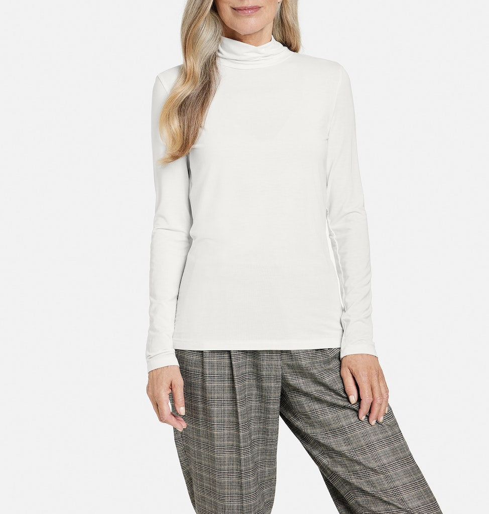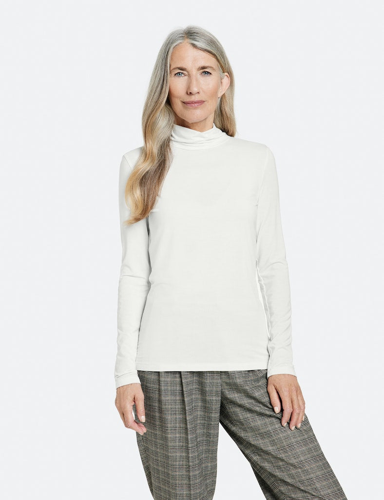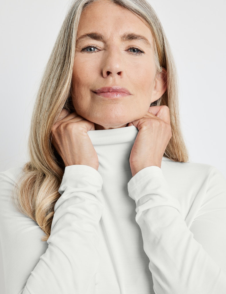 Einfacher Flatlocksaum. Schützt den Hals und sieht super aus! Das leichte Langarmshirt mit locker fallendem Stehkragen ist ein vielseitiger Unterzug, den man am liebsten in allen Farben haben möchte.