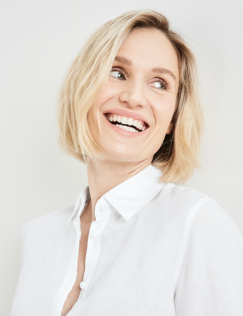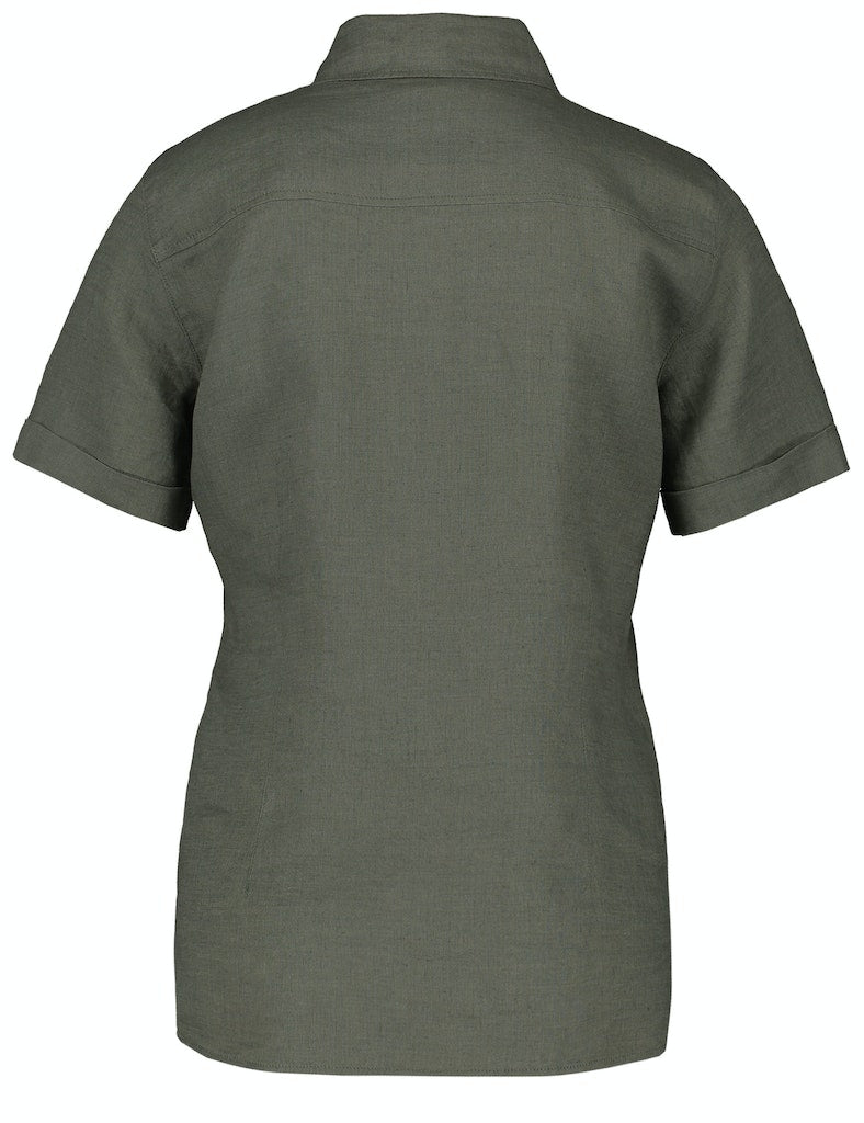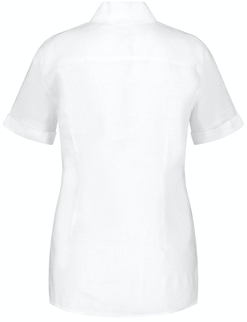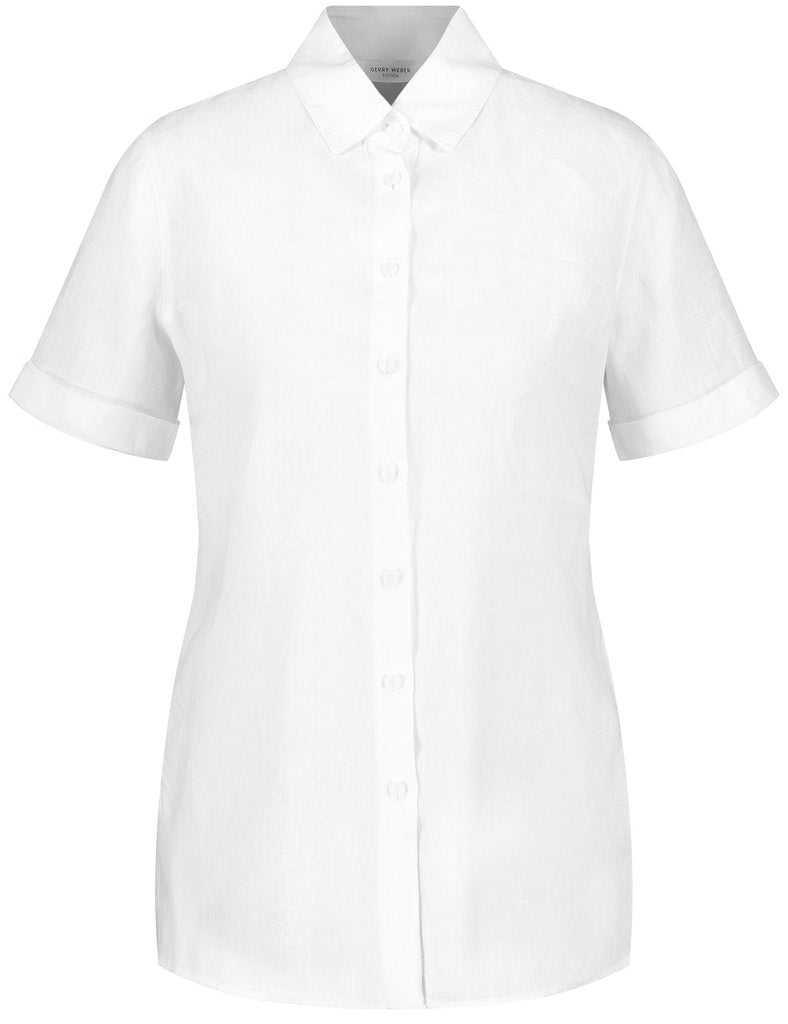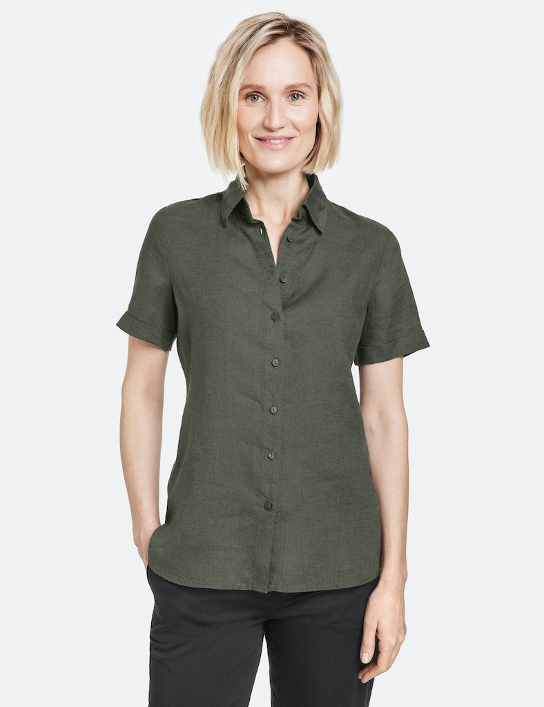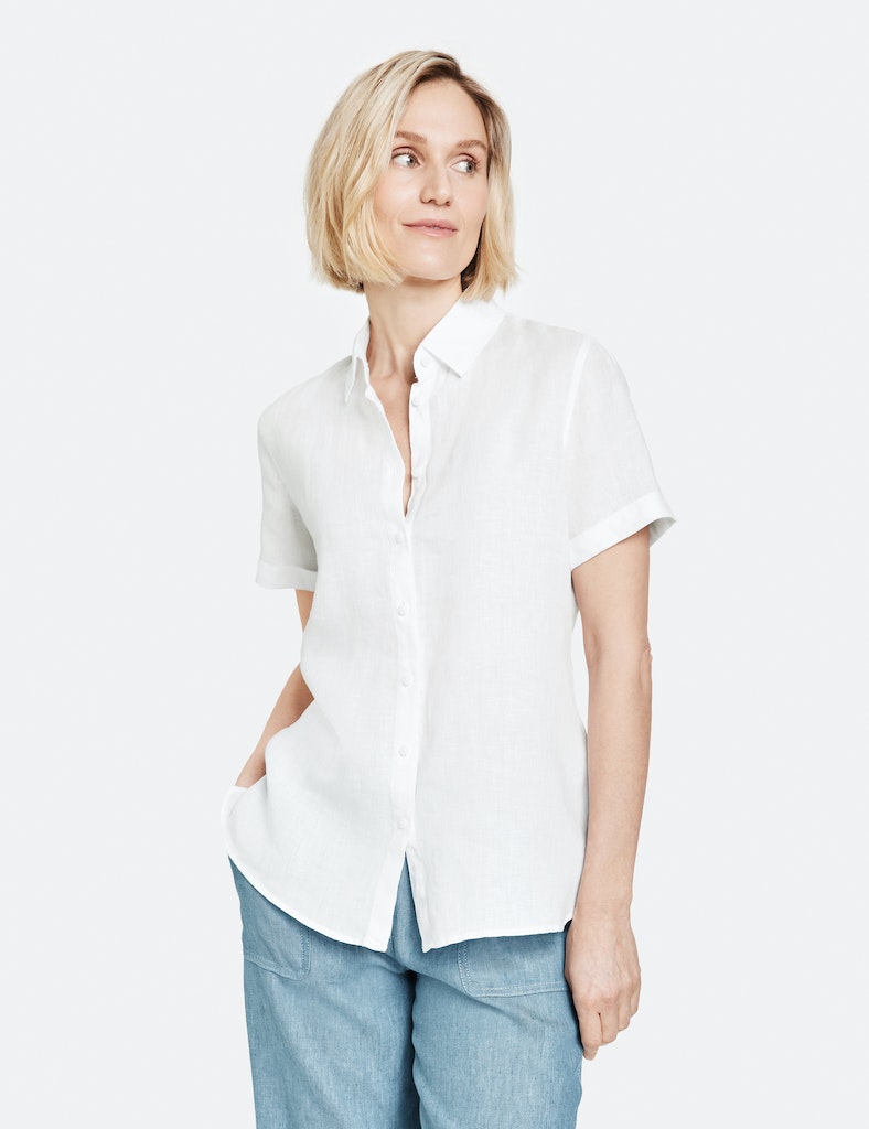 Angesetzte Schulterpasse. Abgerundeter Saum. Ein Klassiker mit feinen Details: Dank dieser Kurzarmbluse mit Ärmelaufschlag lassen sich elegante und lässige Looks kreieren. Seitliche Saumschlitze und formgebende Abnäher am Rückenteil umschmeicheln Ihre Figur. Das reine Leinenmaterial ist nicht nur hautfreundlich, sondern unterstützt auch die Nachhaltigkeit. Mit diesem Modell liegen Sie einfach richtig.