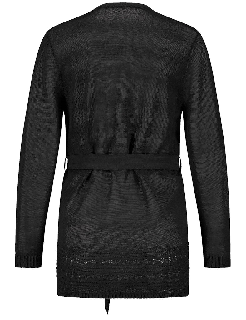 Breites Taillenband mit Schlaufen. Saumkanten in Rippstrick. Geben Sie Ihrem Look ein modisches Upgrade mit unserem Cardigan aus Feinstrick! Das dekorative Häkelmuster am Saum sorgt für einen charmanten Hingucker, während der lockere, offene Schnitt Komfort und Trend vereint. Der breite Bindegürtel schafft Taille. Einfach anziehen und den wohlfühlen!