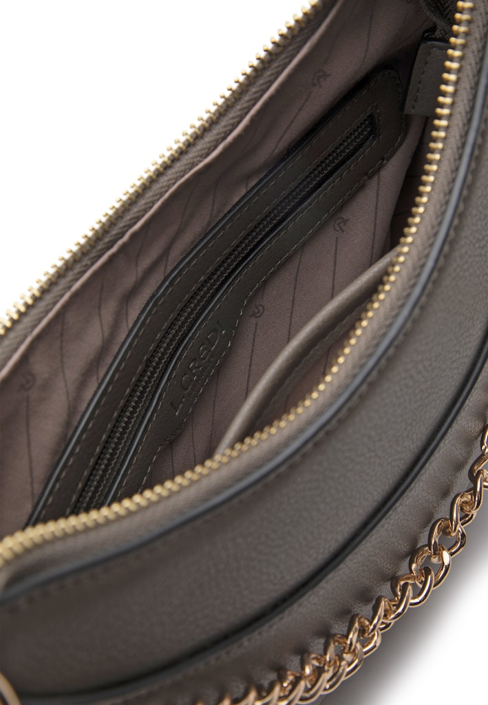 Welch elegante Erscheinung schleicht sich da in unsere Modeherzen? Es ist die bezaubernde Clutch PAULETTE. Sie hat einen bauchigen Taschenkorpus, der ihr die Form eines Halbmondes verleiht. Eine sehr angesagte Taschenform und äußerst beliebt sowohl bei eleganten und als auch legeren Modellen. PAULETTE wird von zwei unterschiedlichen Trageriemen gehalten. Da ist zum einen der verspielte Kettenriemen, der die kleine Abendtasche in einer kurzen Tragevarianten präsentiert. Und zum anderen ein schmaler Schulterriemen aus Kunstleder, identisch zum Obermaterial, der möglichst viel Bewegungsfreiheit ermöglicht.