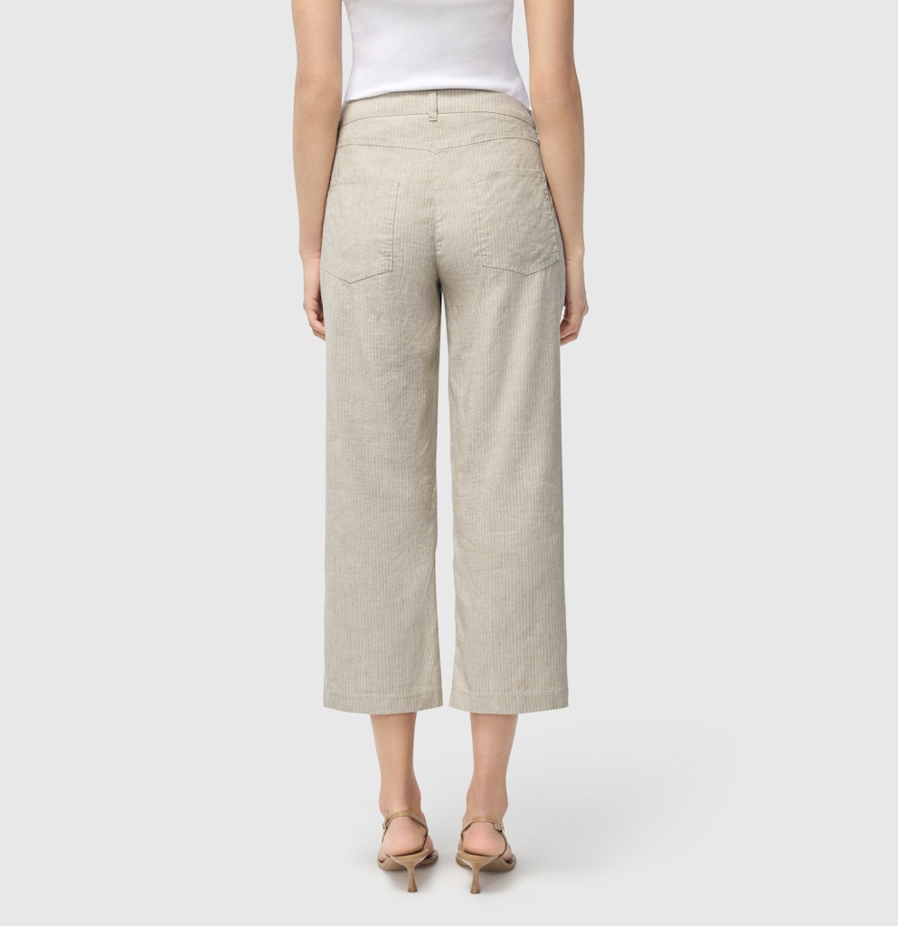 Wide Fit, Wide Leg, gerades, weites Bein, verkürzte Länge, Culotte, mittlere Leibhöhe, bequeme Taille, seitliche Eingrifftaschen vorne, aufgesetzte Taschen hinten, Pure Linen, sehr hochwertige, hautfreundliche Naturfaser-Qualität aus reinem Leinen, leicht im Gewicht, lässig-elegante Optik, temperaturausgleichend und angenehm kühl auf der Haut, langlebige Qualität, hoher Tragekomfort, Das Model ist 1,75m groß und trägt die MAC Hosengröße 36, Fußweite bei Größe 36: 44cm