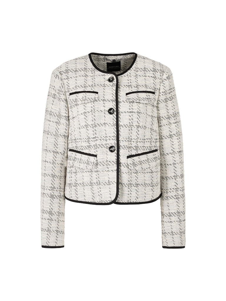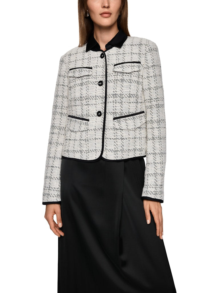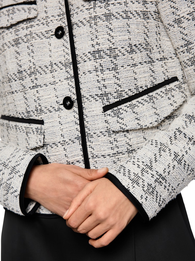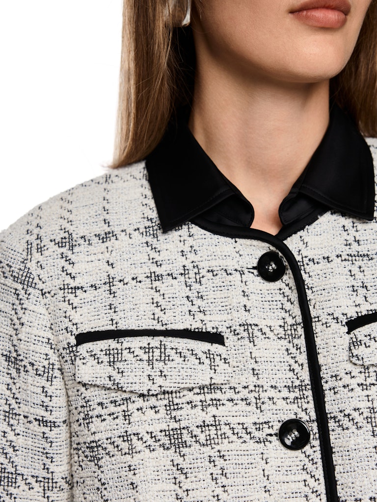 Elegante Jacke mit exklusivem Jacquardmuster und couturigem Design. Kontrastfarbene Details setzen stilvolle Akzente. Mit rundem Ausschnitt, Knopfverschluss und vier Klappen bietet sie modische Raffinesse. Perfekt für einen edlen Look mit Charakter.