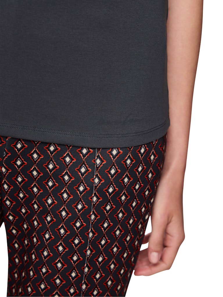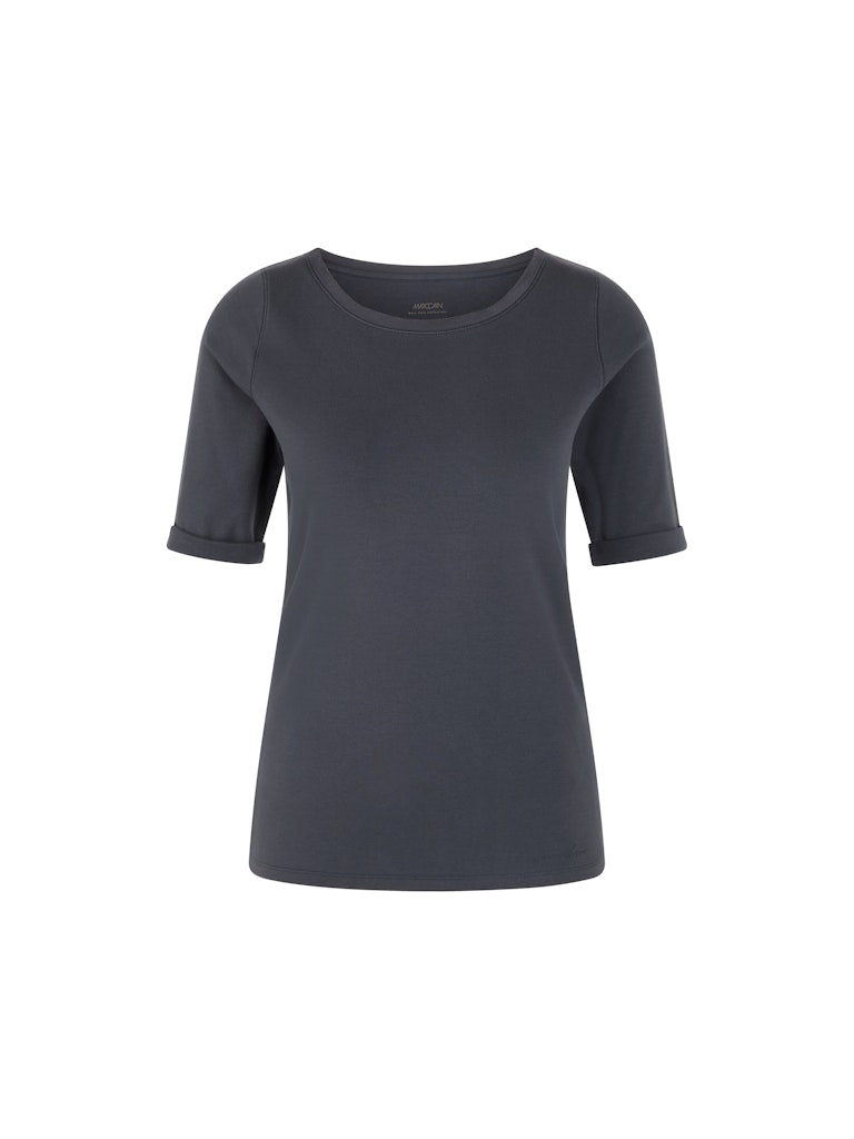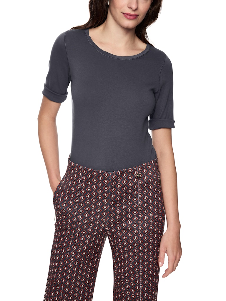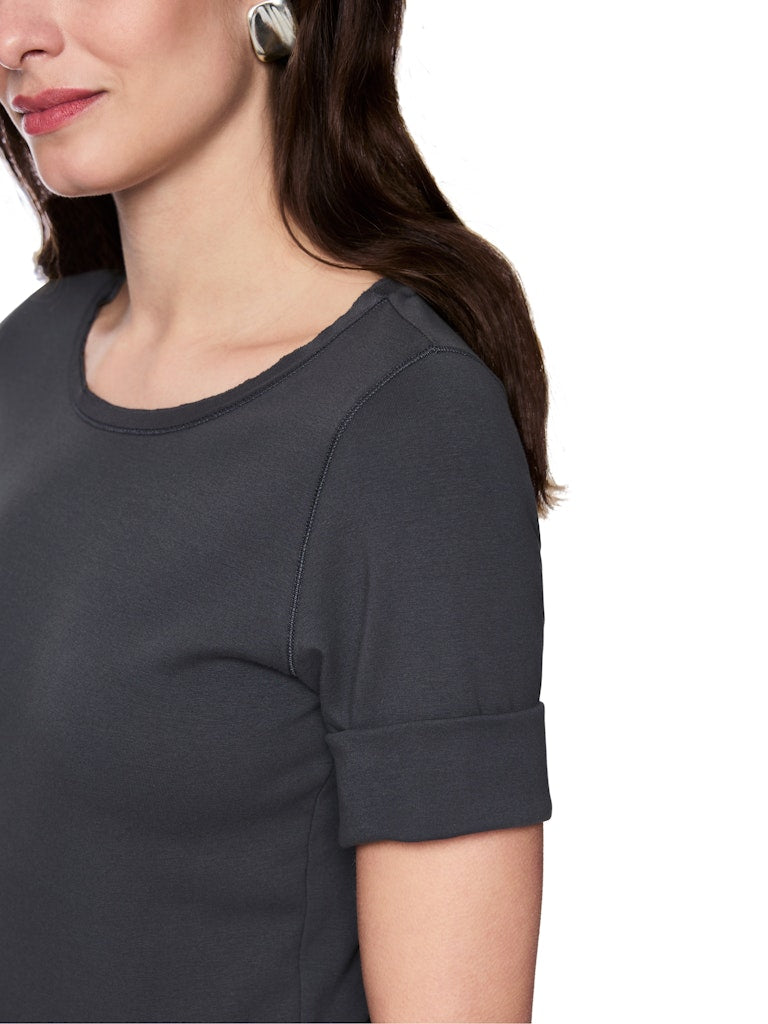 Schmal geschnittenes Shirt aus weichem Baumwollstretch mit edlen Seidenblenden. Der Rundhalsausschnitt und die halblangen Ärmel sorgen für zeitlose Eleganz, während der elastische Stoff angenehmen Komfort bietet. Ein vielseitiges Basicshirt, das sich perfekt kombinieren lässt.