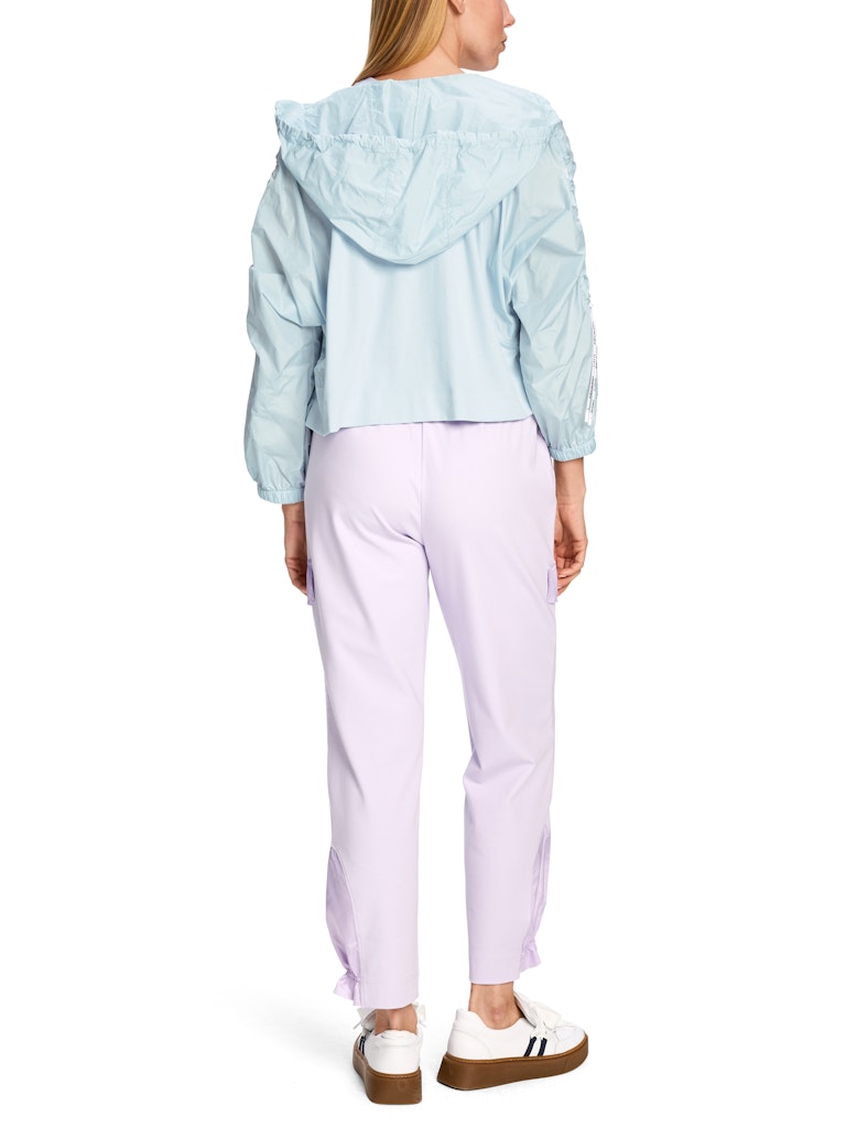 Durch ihren angenehmen Material-Mix mit Baumwollstretch und fließendem Webmaterial ist diese Jacke ein toller Begleiter bei sportlichen Aktivitäten. Der außergewöhnliche Schnitt zeigt individuell verstellbare Ärmel mit Kordel und Stopper. Die Jacke kommt mit großer Kapuze und ist in der Front ohne Verschluss.