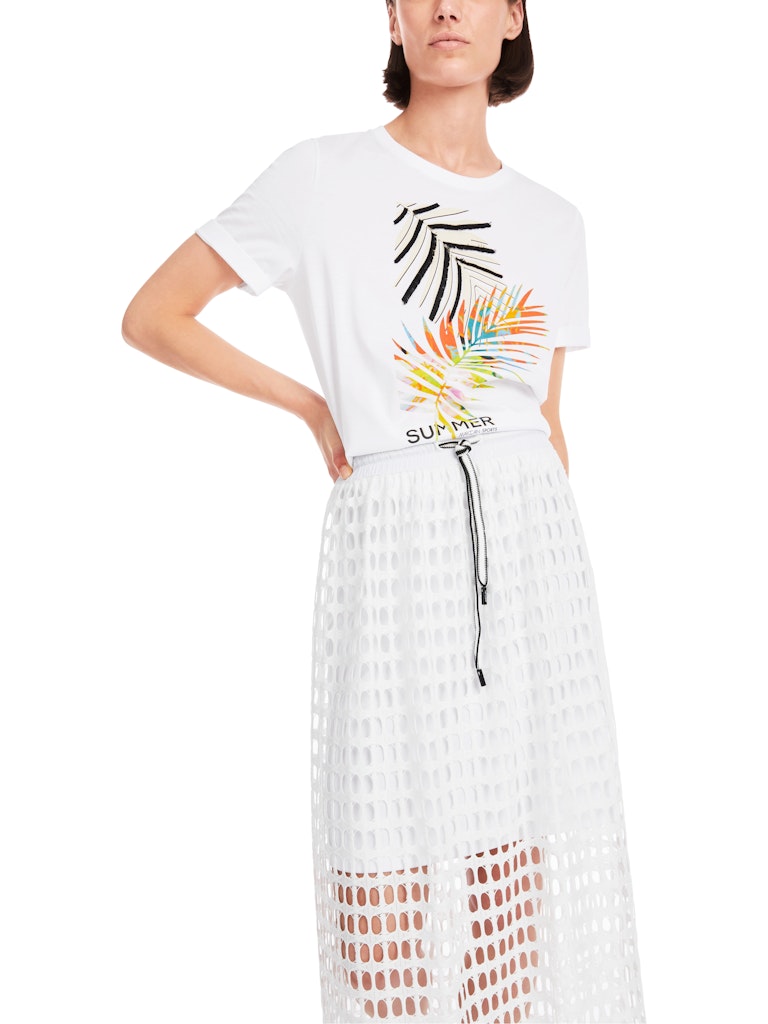 Langärmeliges Shirt aus stretchigem Baumwoll-Ripp. Das Modell hat eine schmale Form und einen leicht erhöhten Rundhals. Fancy, die Ärmel und Halsausschnitt, die mit einem gewellten Saum abschließen. Die Front und den Ärmel zieren einen Leo-Druck mit Blumen in Siebdruck-Optik.