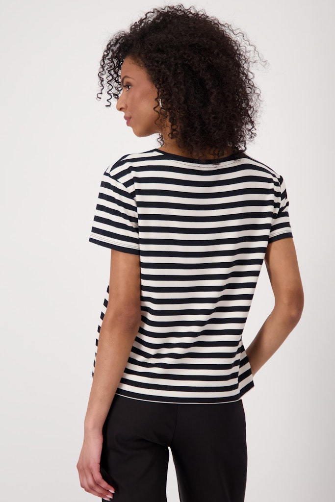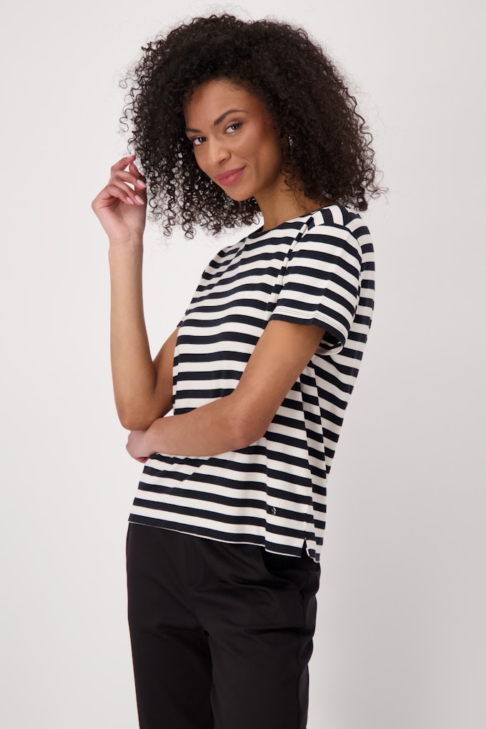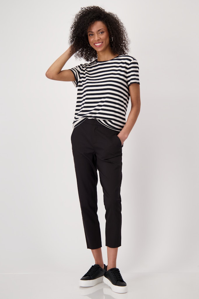 Dieses gestreifte T-Shirt besteht aus einer angenehmen Mischung aus Viskose und Modal. Das elastische Material sorgt für einen perfekten Sitz. Mit klassischem Rundhalsausschnitt und kurzen Ärmeln.