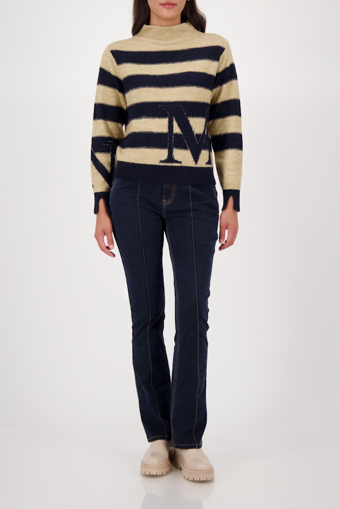 Eleganter Pullover aus fließender Viskose mit Ringelmuster, geschmückt mit Strasssteinen, Stehkragen und Intarsienmuster – ein Must-have!
