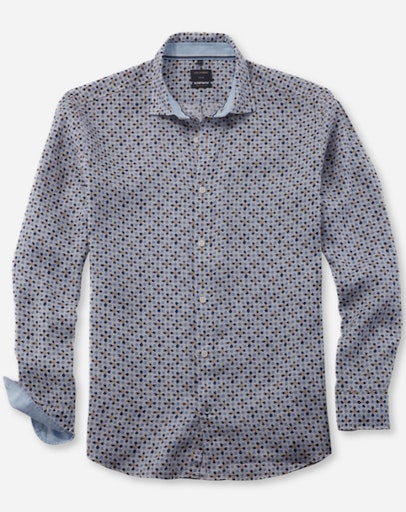 Ob elegant oder leger inszeniert: Dieses kreativ inspirierte Dessin wirkt je nach Blickrichtung floral oder grafisch – und ist in jedem Fall ein Blickfang. Bedruckt wurde hundertprozentiges Leinen mit den bewährten Trage- und Pflegeeigenschaften. Für lässige Eleganz mit klassischem Kent und gerundetem Saum. Ein stilvolles OLYMP Casual in Beige.