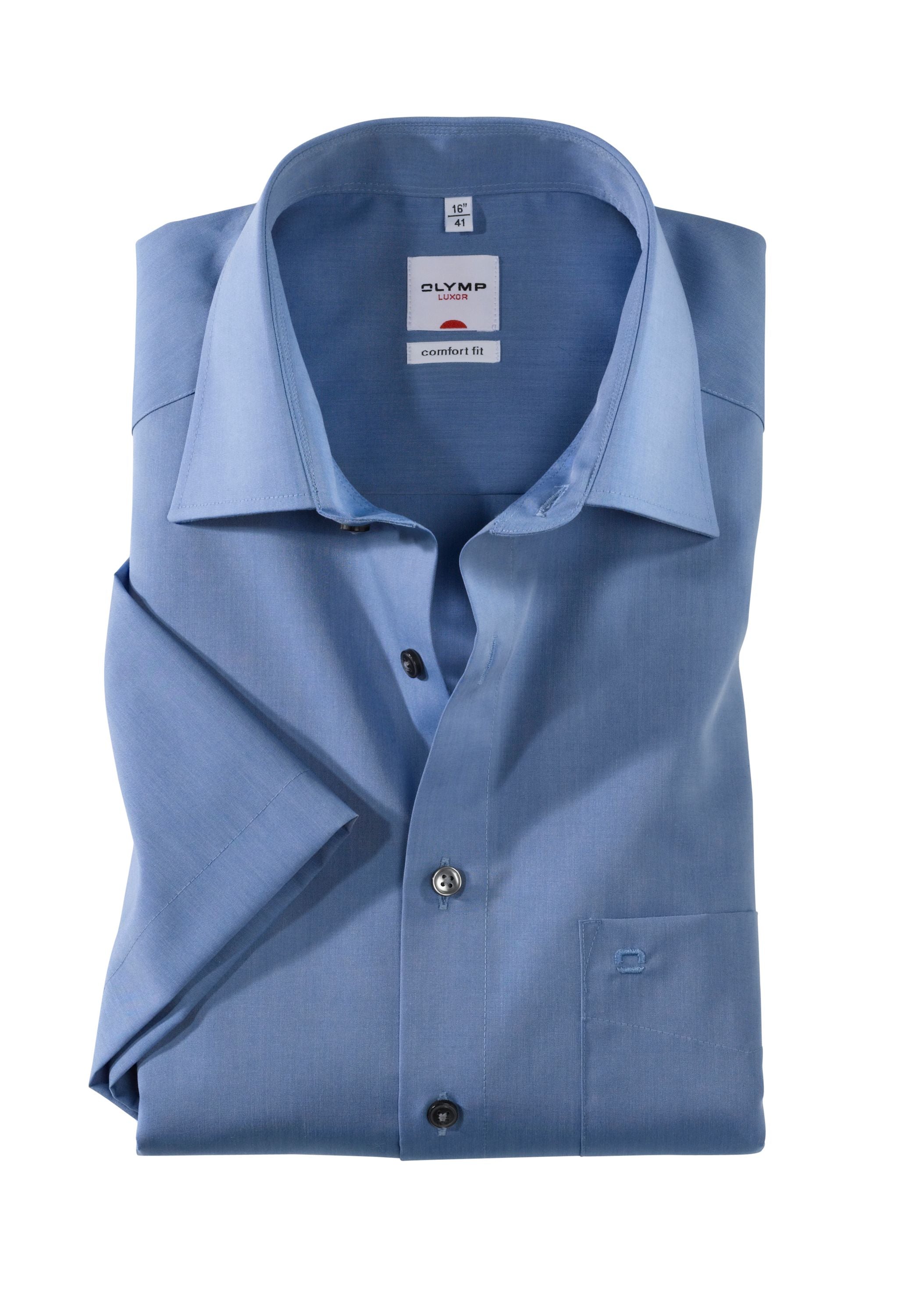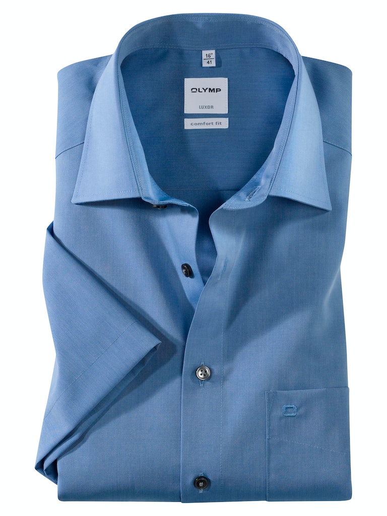 Einfach waschen, trocknen, anziehen – das Kurzarmhemd der Linie OLYMP Luxor comfort fit mit New-Kent-Kragen bleibt auch ohne bügeln den ganzen Tag glatt. Der Oberstoff mit Chambray-Struktur in Blau rundet das Gesamtbild ab.