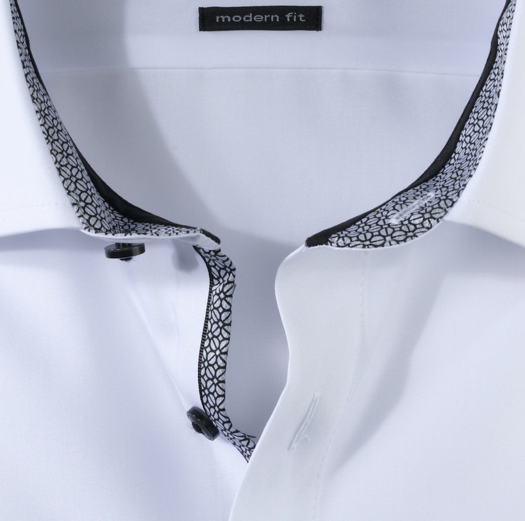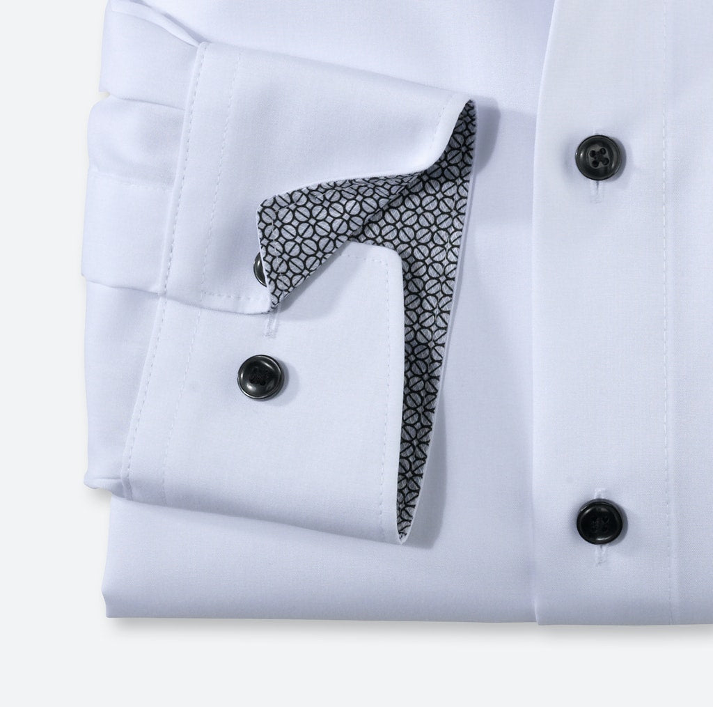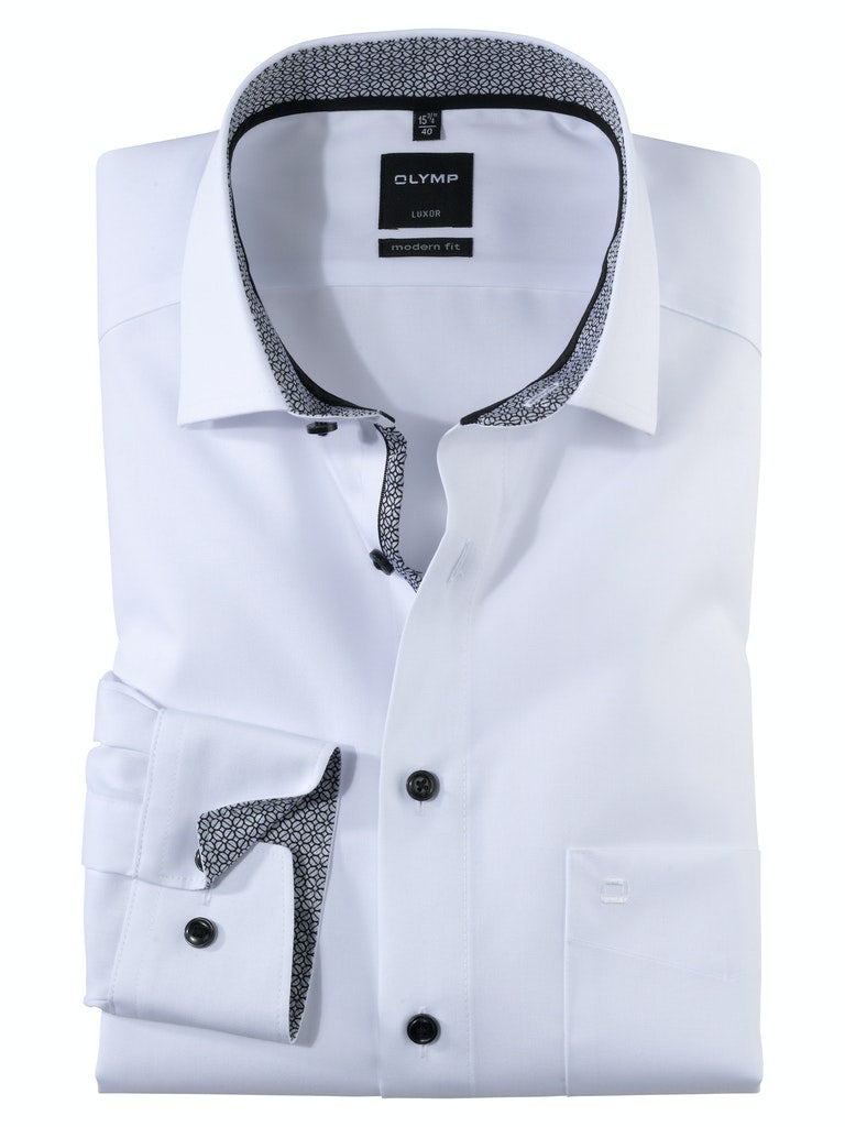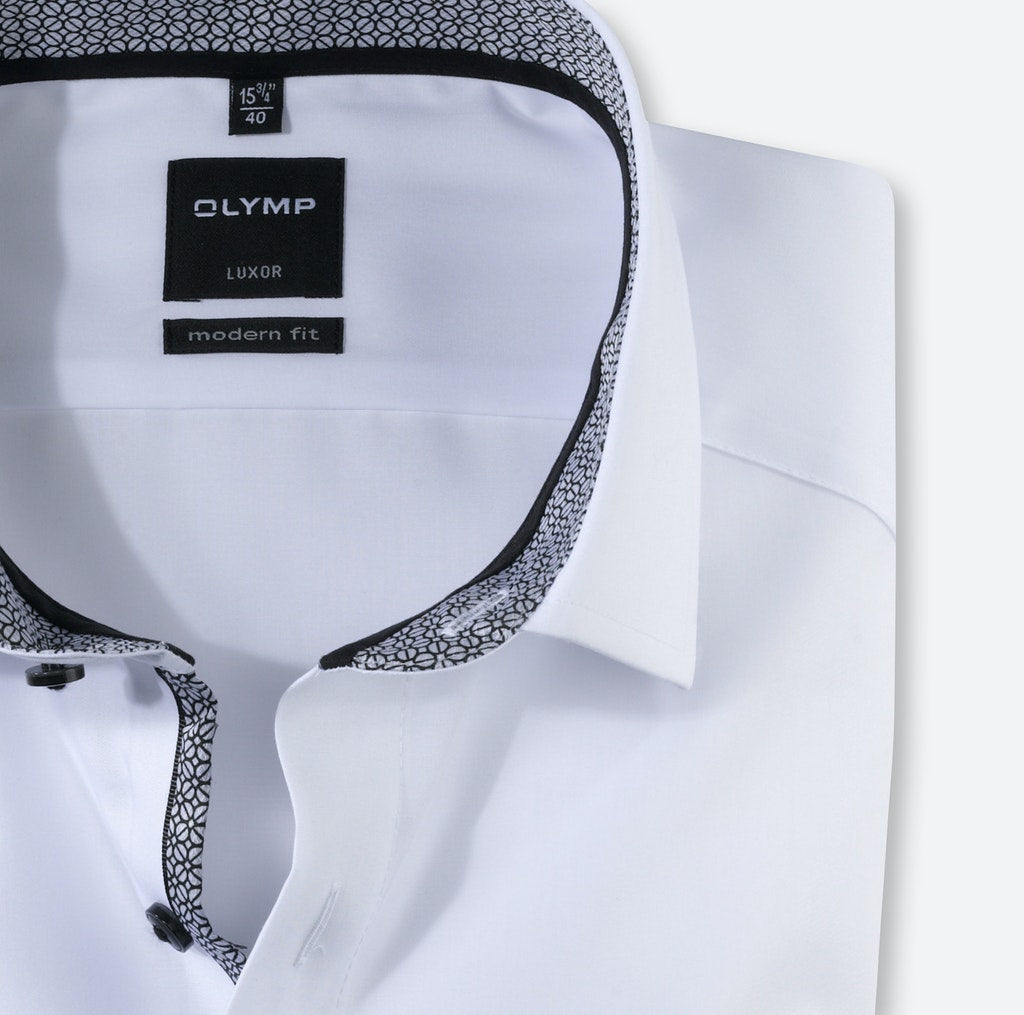 Einfach waschen, trocknen, anziehen – OLYMP Luxor modern fit bleibt auch ohne Bügeln den ganzen Tag glatt. Das knitter- und bügelfreie Businesshemd aus 100% Baumwolle macht immer eine gute Figur. Der Oberstoff in Weiß harmoniert mit dem geschmackvoll darauf abgestimmten Kontrastgewebe am Krageninnensteg und den Innenmanschetten in perfekter Art und Weise. Ein eleganter Global-Kent-Kragen sowie weitenverstellbare Kombimanschetten und die paspelierte Knopfleiste machen den Style komplett. Der atmungsaktive und hautsympathische Stoff hält jeden Stress aus.