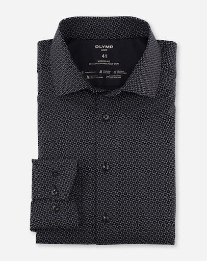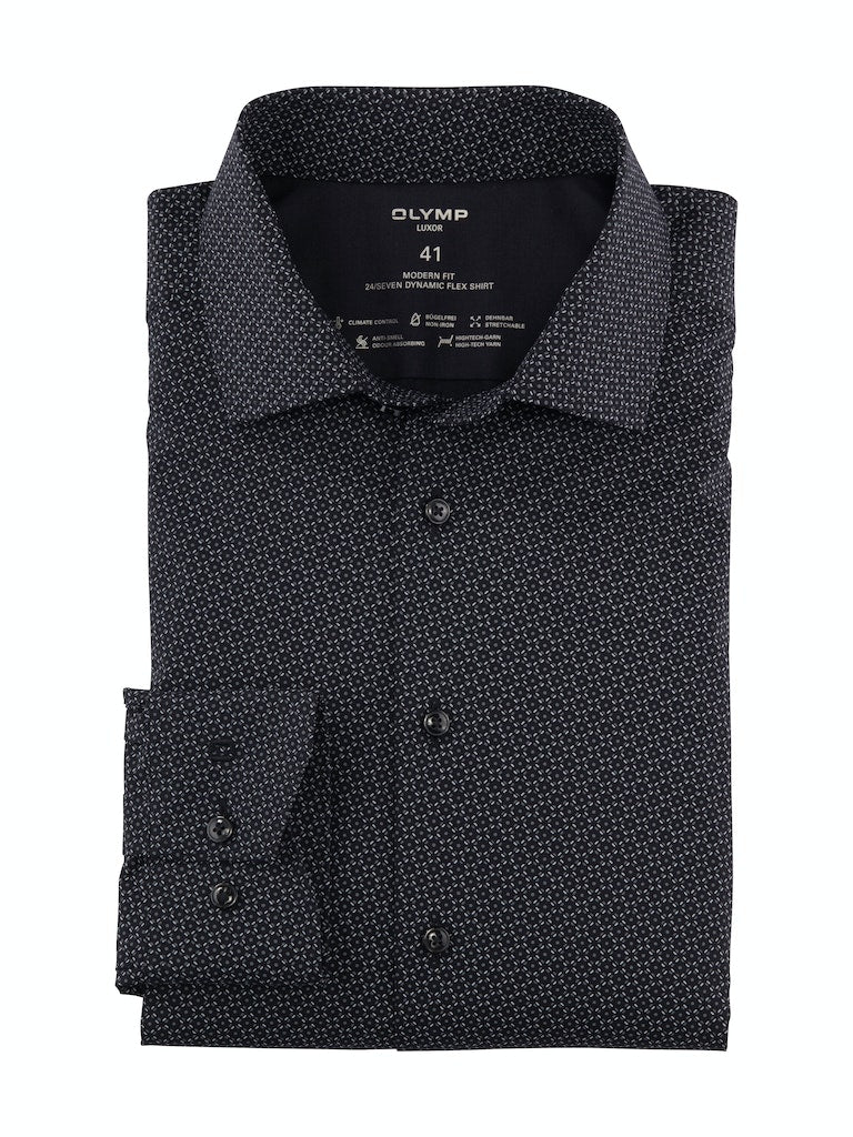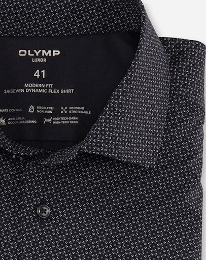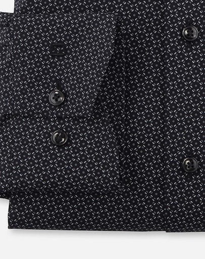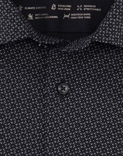 Mit innovativen CLIMATE-CONTROL-Garnen überzeugt das OLYMP Luxor 24/Seven Businesshemd durch atmungsaktive, elastische, pflegeleichte sowie temperatur- und feuchtigkeitsregulierende Funktionalität. Der grafische Print mit Akzentuierung auf Schwarz, die körpernahe Silhouette und ein kosmopolitischer Global Kent vollenden die modische Performance. Sportiv, ohne Brusttasche.