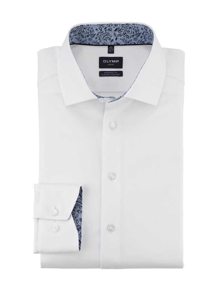 Die innovative OLYMP Luxor Climate-Control-Faser ist atmungsaktiv, dehnbar, schnelltrocknend sowie temperatur- und feuchtigkeitsregulierend. Die Textur dieses weißen, körpernah geschnittenen Businesshemdes ist speziell blickdicht. Der weltoffene Global Kent punktet modisch mit kontrastivem Print-Innenbesatz.