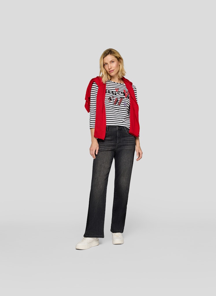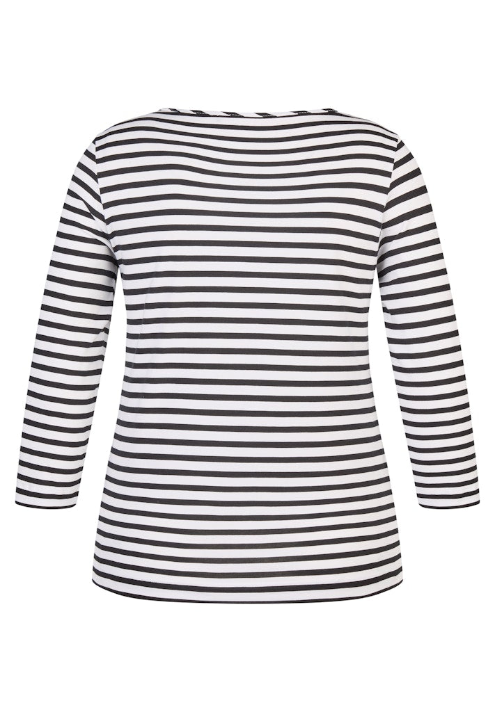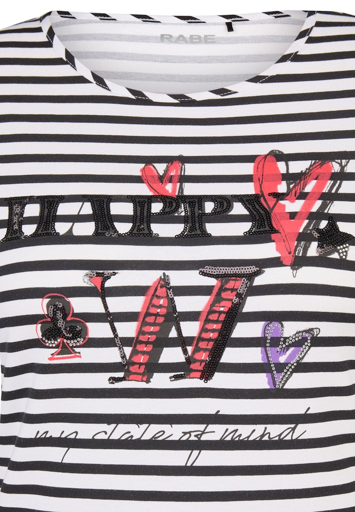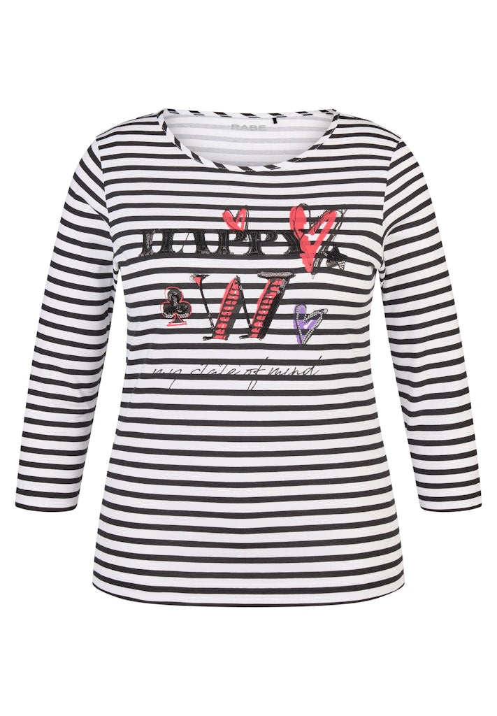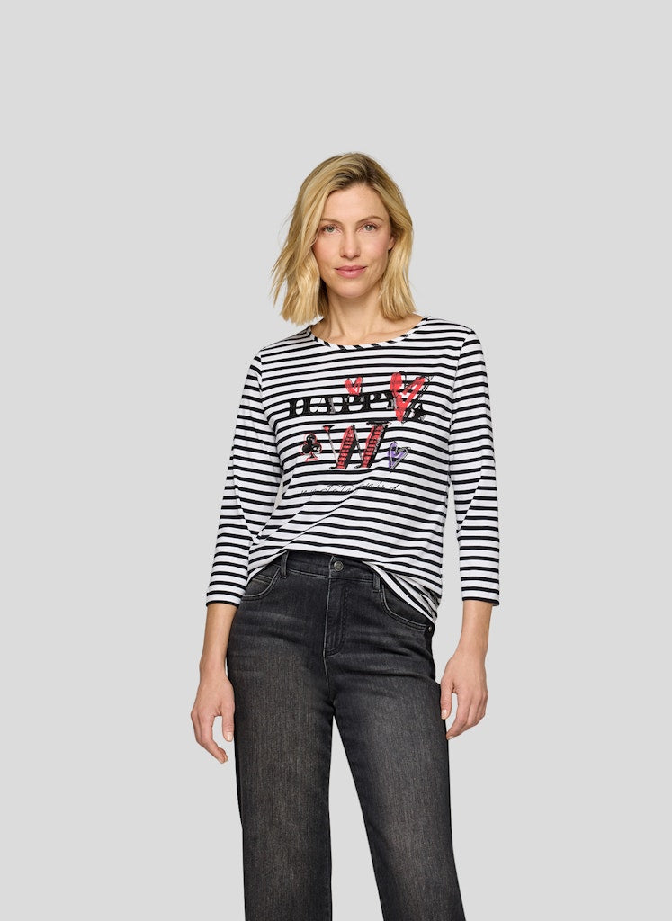 Dieses Shirt kombiniert klassischen Ringel-Look mit verspieltem Frontprint und dekorativen Akzenten.Rundhalsausschnitt.3/4-Ärmel.Platziertes Motiv mit Schriftzug und Glanzdetails.Bequeme Passform.Weiche Jersey-Qualität.