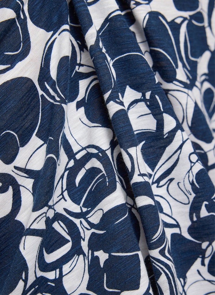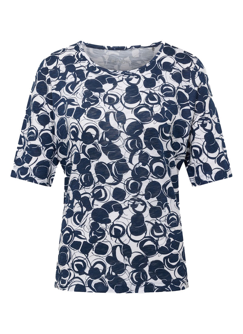 Dieses Shirt bringt mit seinem dynamischen Allover-Muster frischen Schwung in Ihre Garderobe. Die abstrakten Formen verleihen dem Look eine kreative Note, während der klassische Schnitt mit Rundhalsausschnitt für optimalen Tragekomfort sorgt. Perfekt für urbane Alltagsoutfits oder als modisches Statement im Büro.Abstrakter Allover-Print mit modischem Flair.Bequemer Rundhalsausschnitt.Halbarm für angenehme Bewegungsfreiheit.Leicht taillierter Schnitt für eine feminine Silhouette.Pflegeleichte, elastische Qualität.