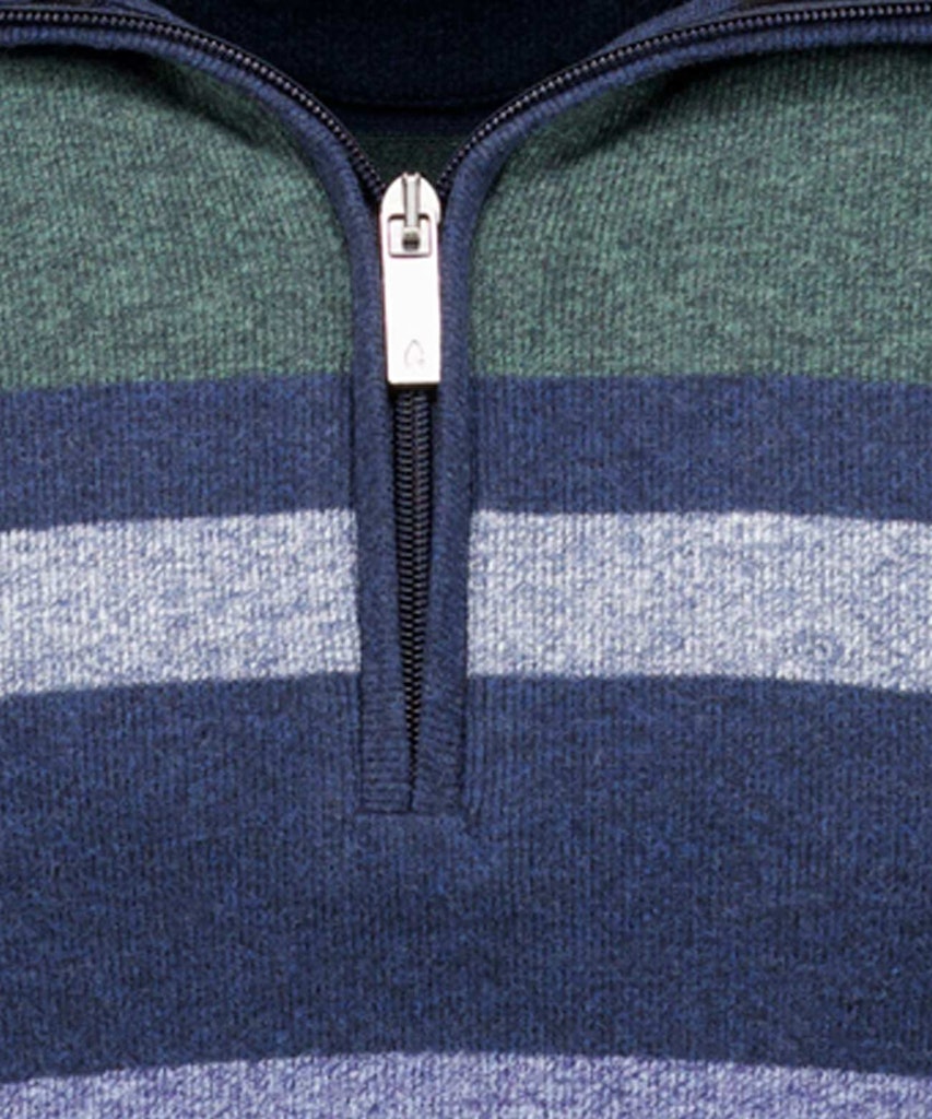 Dieser RAGMAN Sweater spielt mit sportiven Streifen wie ein College-Sweater aus den guten alten Tagen – nur eben moderner, weicher und eindeutig tragelustiger. Der fein melierte Jaspé-Look bringt Struktur, der Pfirsichtouch sorgt für maximalen Komfort. Der Stehkragen mit Zipper verleiht dem Ganzen eine Portion Coolness – perfekt für smarte Casual-Looks, ob zur Chino, Denim oder Sneaker. Vintage-Vibes treffen Wohlfühlfaktor – und RAGMAN trifft ins Schwarze.