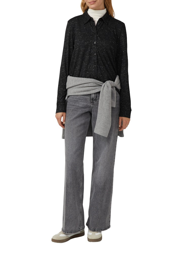 Glamouröse Jerseybluse mit schimmerndem Glitzergarn für deinen entspannten Casual-Look. Der verlängerte Rückensaum und der klassische Hemdkragen verleihen dem weichen Viskose-Mix eine elegante Note. Mit Knopfleiste im relaxten Fit.