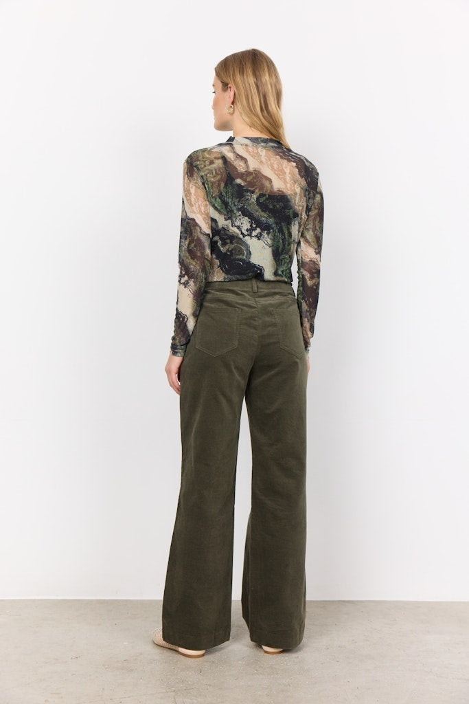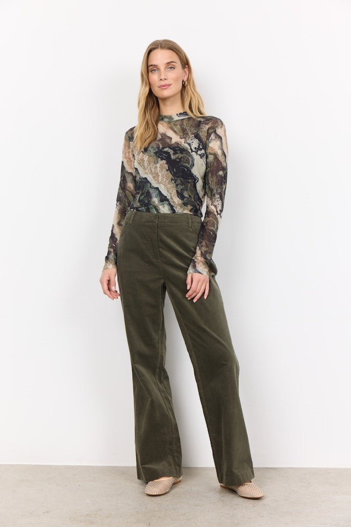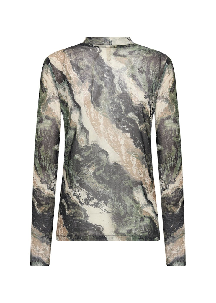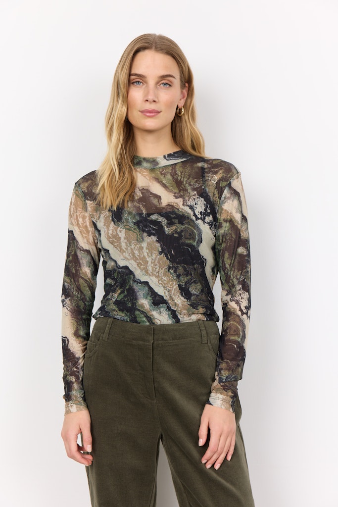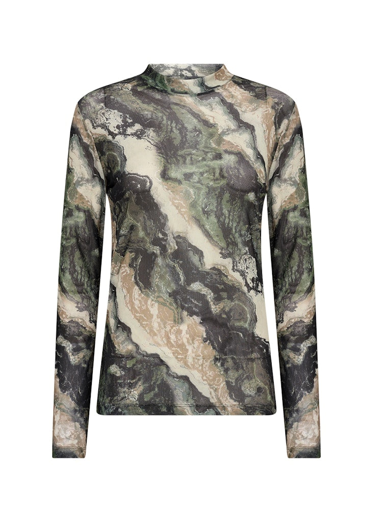 SC-Alda AOP 55 ist ein feminines T-Shirt aus einer schönen Mischung aus recyceltem Polyester und Elastan. Das T-Shirt hat einen hohen Ausschnitt, lange Ärmel, eine enge Passform, ein halbdurchsichtiges Material und einen schönen organischen Druck. Stylen Sie dieses schöne T-Shirt mit einer Anzughose und einem Blazer für einen schönen Look.